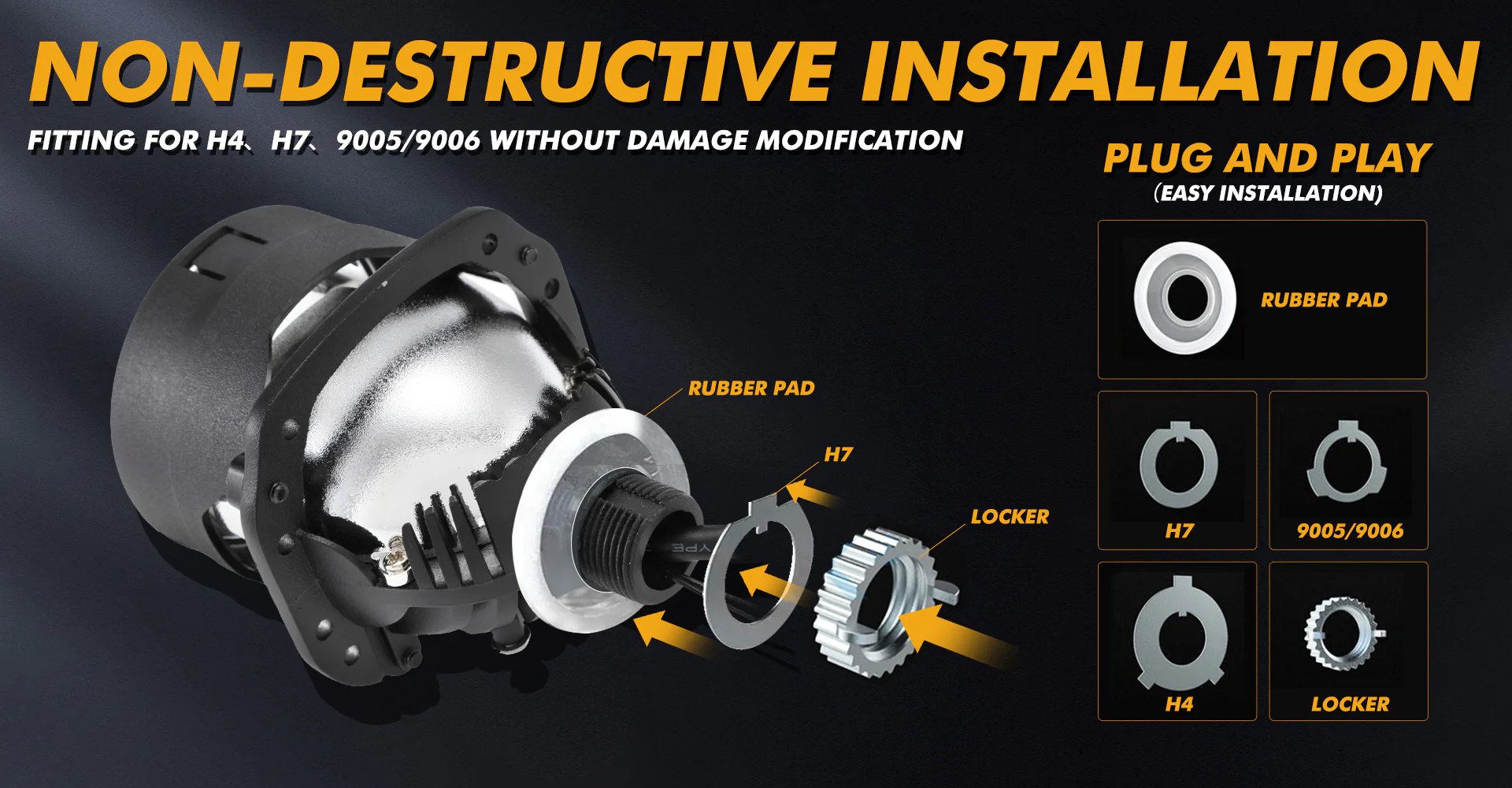 - It has a threaded shaft base that locks the projector to automotive headlight hardware and can be installed in H4/H7/9005/9006 headlights. The 3-inch lightweight body is suitable for 95% of cars.