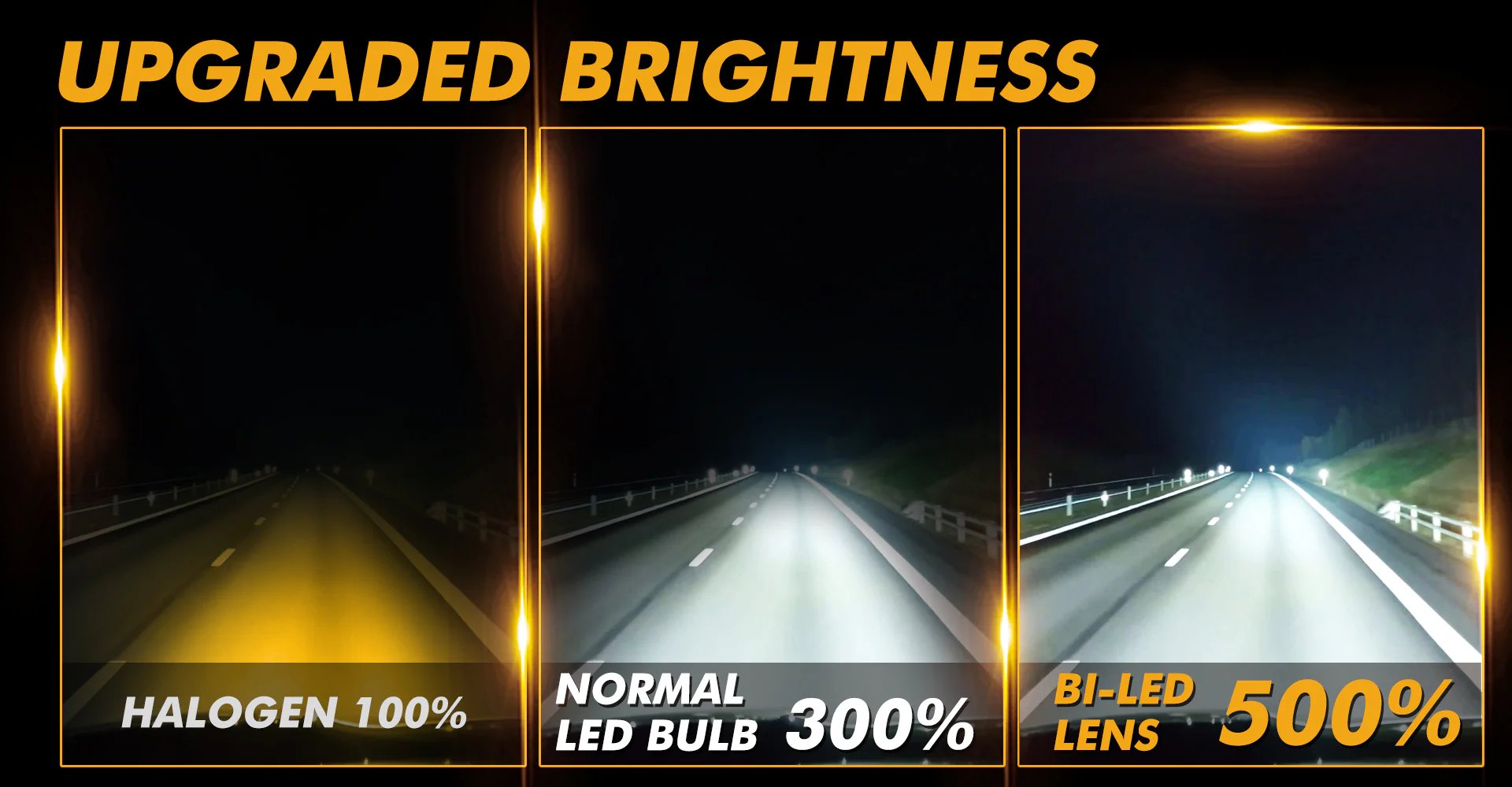 - Adopt 6pcs LED chips for low beams and an additional 3 direct auxiliary high beam lenses, illuminating the road up to an impressive 800 meters—5 times brighter than standard halogen lights.