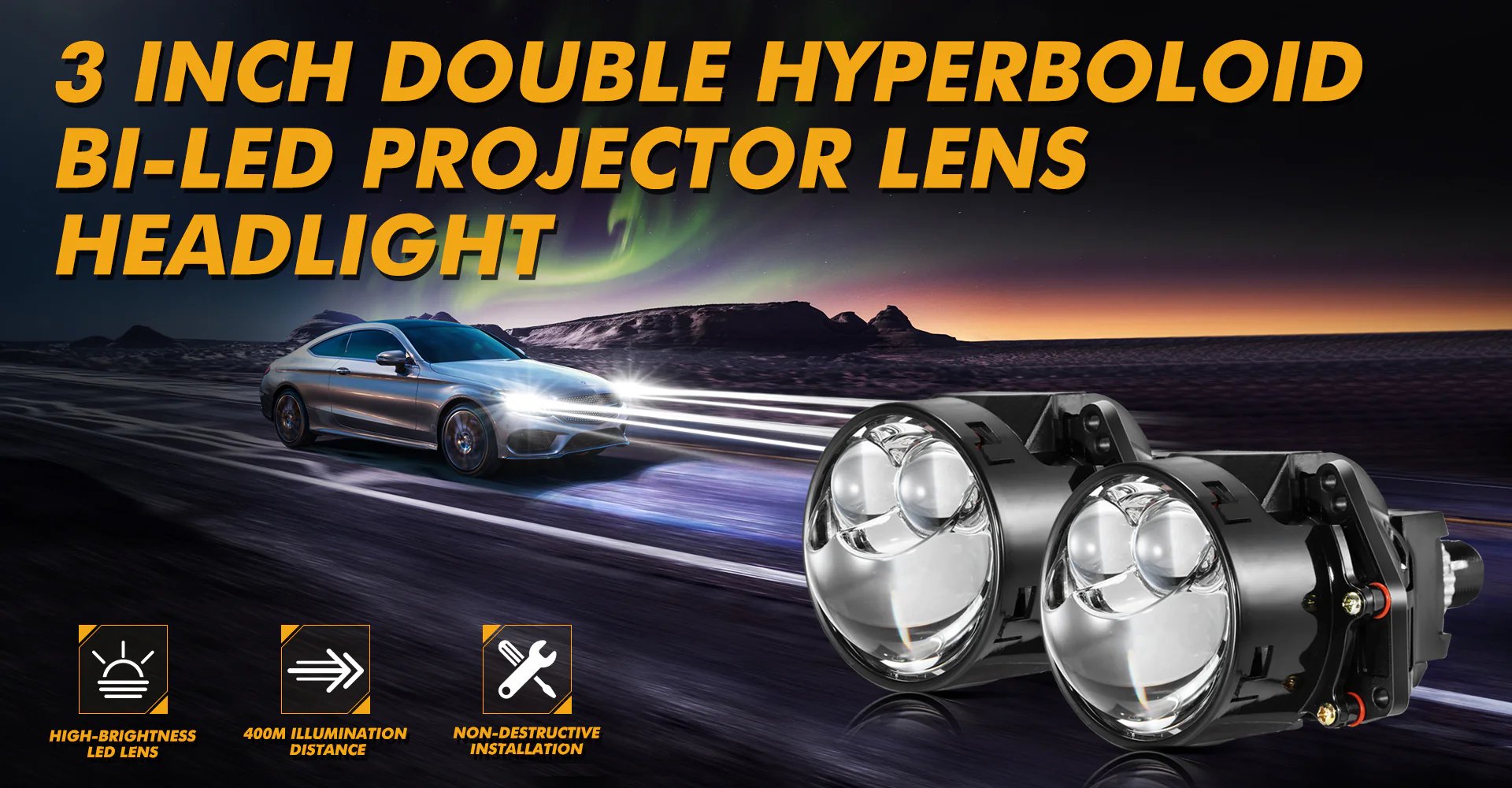 - The full aviation aluminum body and built-in 12,000RPM silent turbo cooling fan, provide fast and stable heat dissipation to maximize the lifetime and brightness of the bi-LED projector lens headlight.